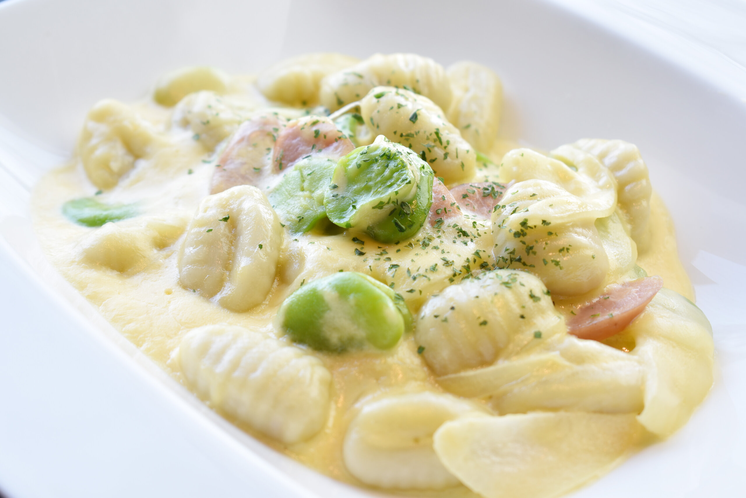- 卡門貝爾起司和蠶豆義大利麵疙瘩豆漿卡邦尼義大利麵