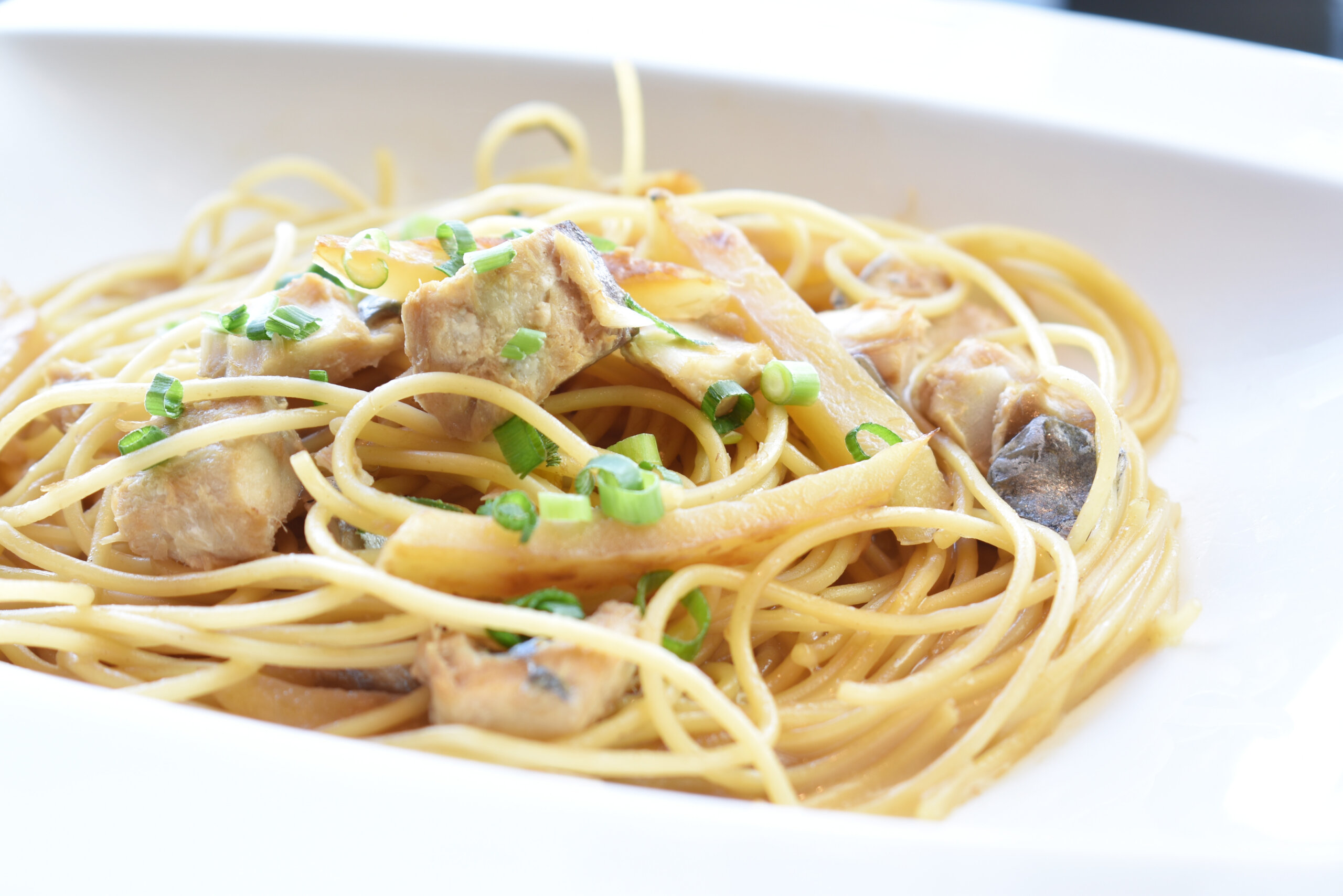 - 鯖魚馬鈴薯義大利麵配蒜香奶油醬油