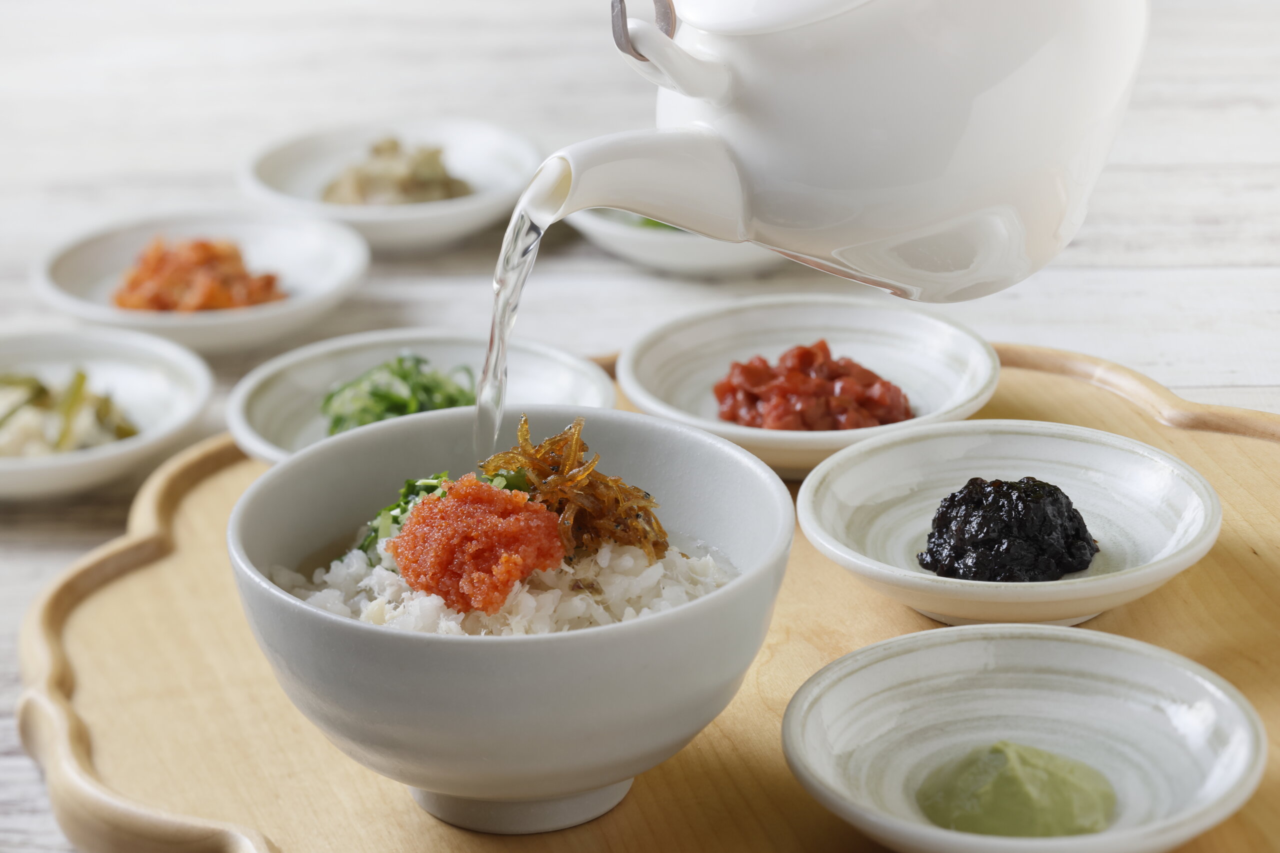先是原汁原样,然后倒入高汤,制成高汤茶汁。 有十多种米饭搭配,摆放成自己喜欢的美味非常有趣!
